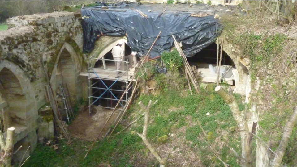 The roof of the convers’ building has no ridge beam and continues to sag despite emergency work in 2017. It is in urgent need of restoration: replacing defective beams and wall plates, straightening trusses, repairing broken elements and reslating. The salle basse, covered for two decades only by tarpaulins, remains propped by temporary scaffolding. Its vaults, columns and masonry are severely weakened, requiring permanent consolidation and a protective roof terrace. Without these works, the structure will not survive further winters.