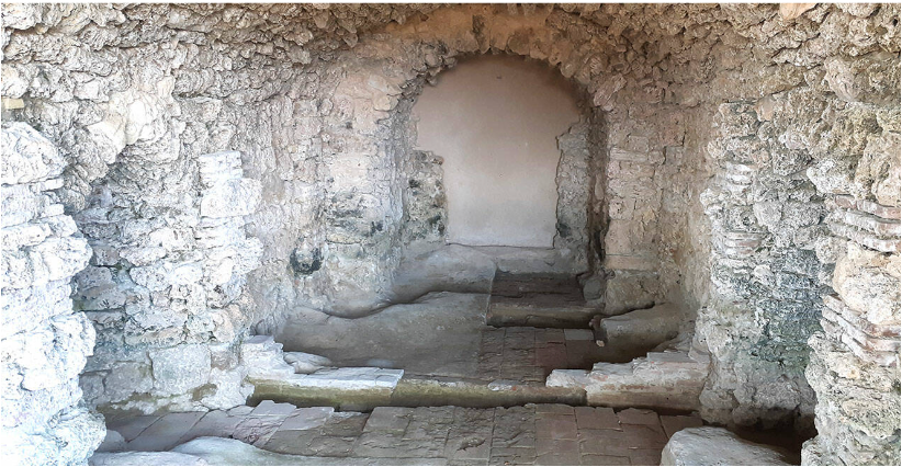 Today, the structure is at risk of collapsing. It requires a significant restoration program to stabilize its state of preservation and enable its presentation to the general public. At the start of the restoration project, the cave’s original floor and remnants of conduits were uncovered, providing evidence of thoughtful hydraulic activity in relation to the surrounding park.